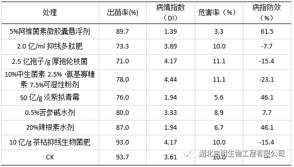 調(diào)查結(jié)果表明,各處理小區(qū)線蟲病發(fā)生整體較輕,對照區(qū)的病情指數(shù)僅為3.61,危害率為10.0%,這與2019年山藥生長期間天氣嚴重干旱有關(guān)。